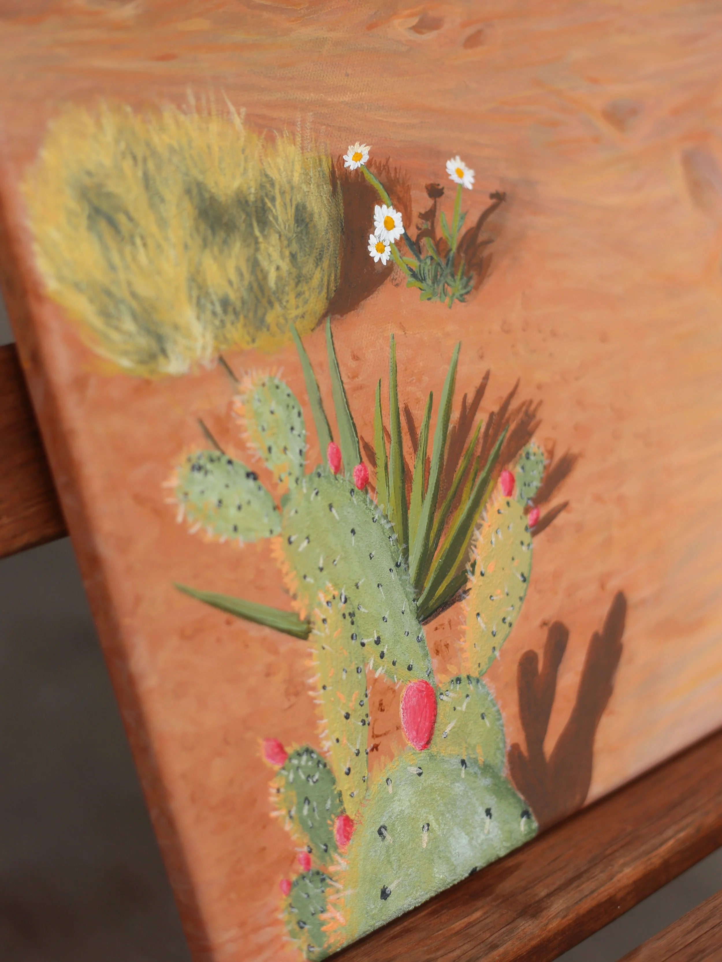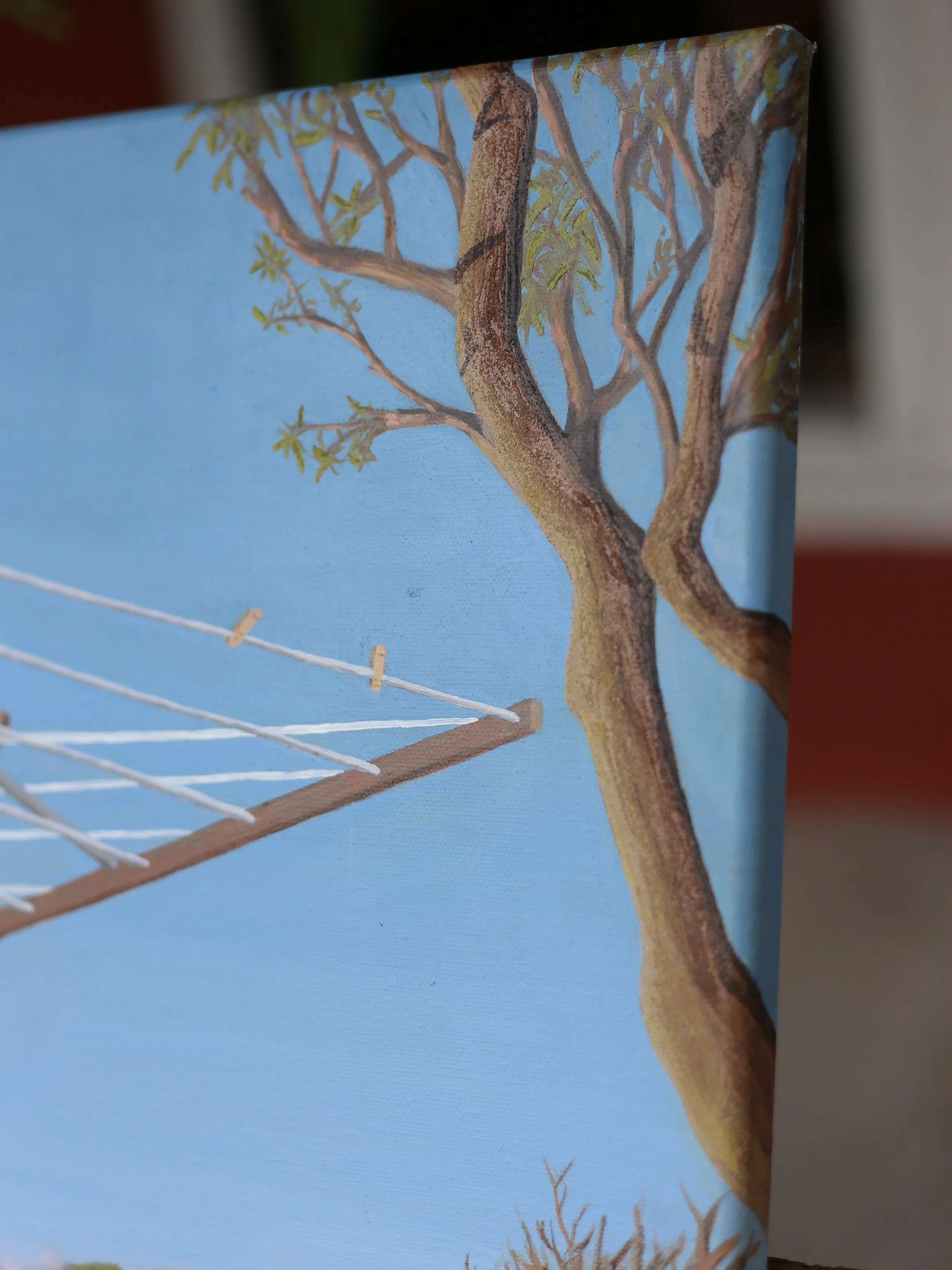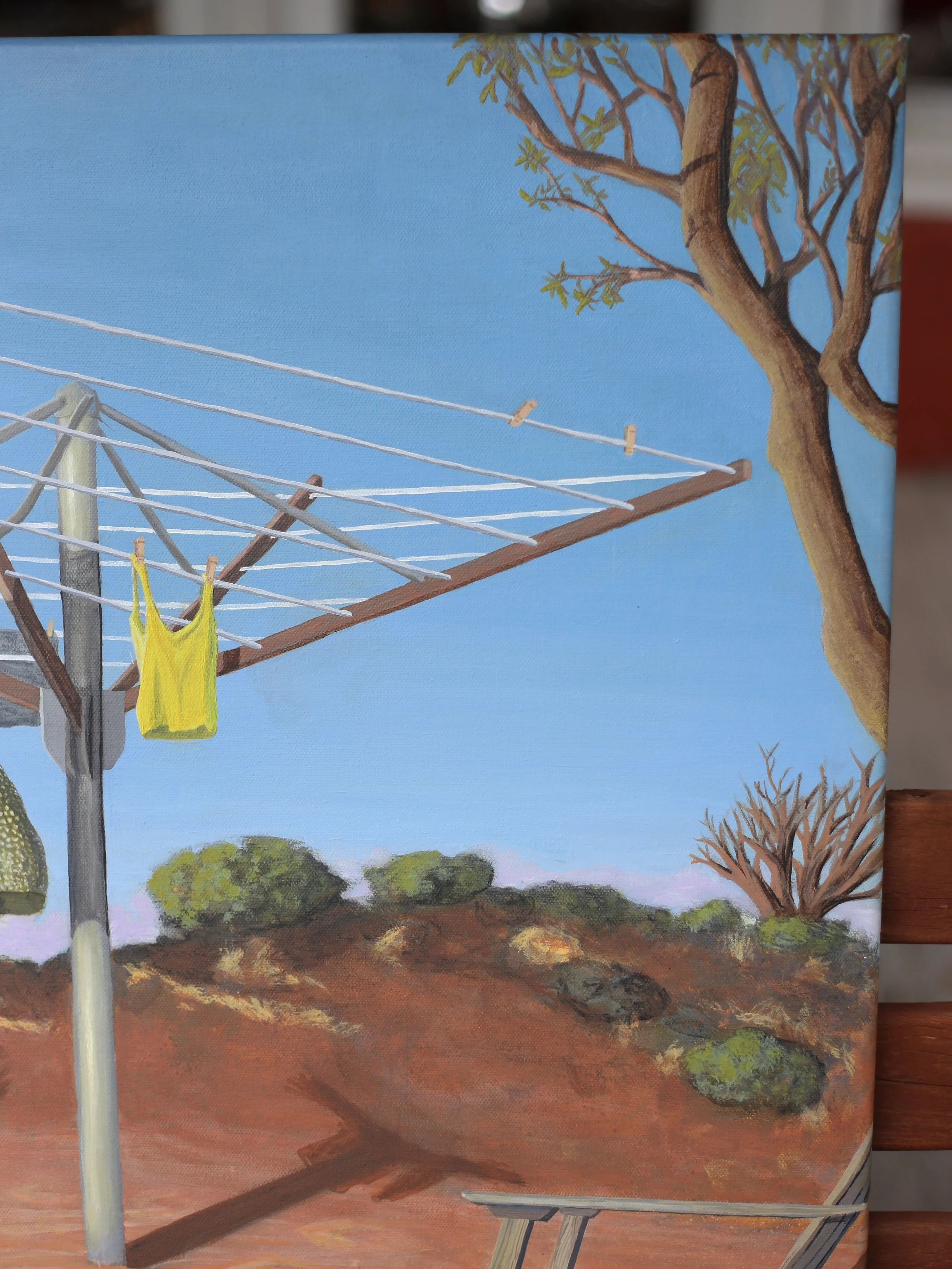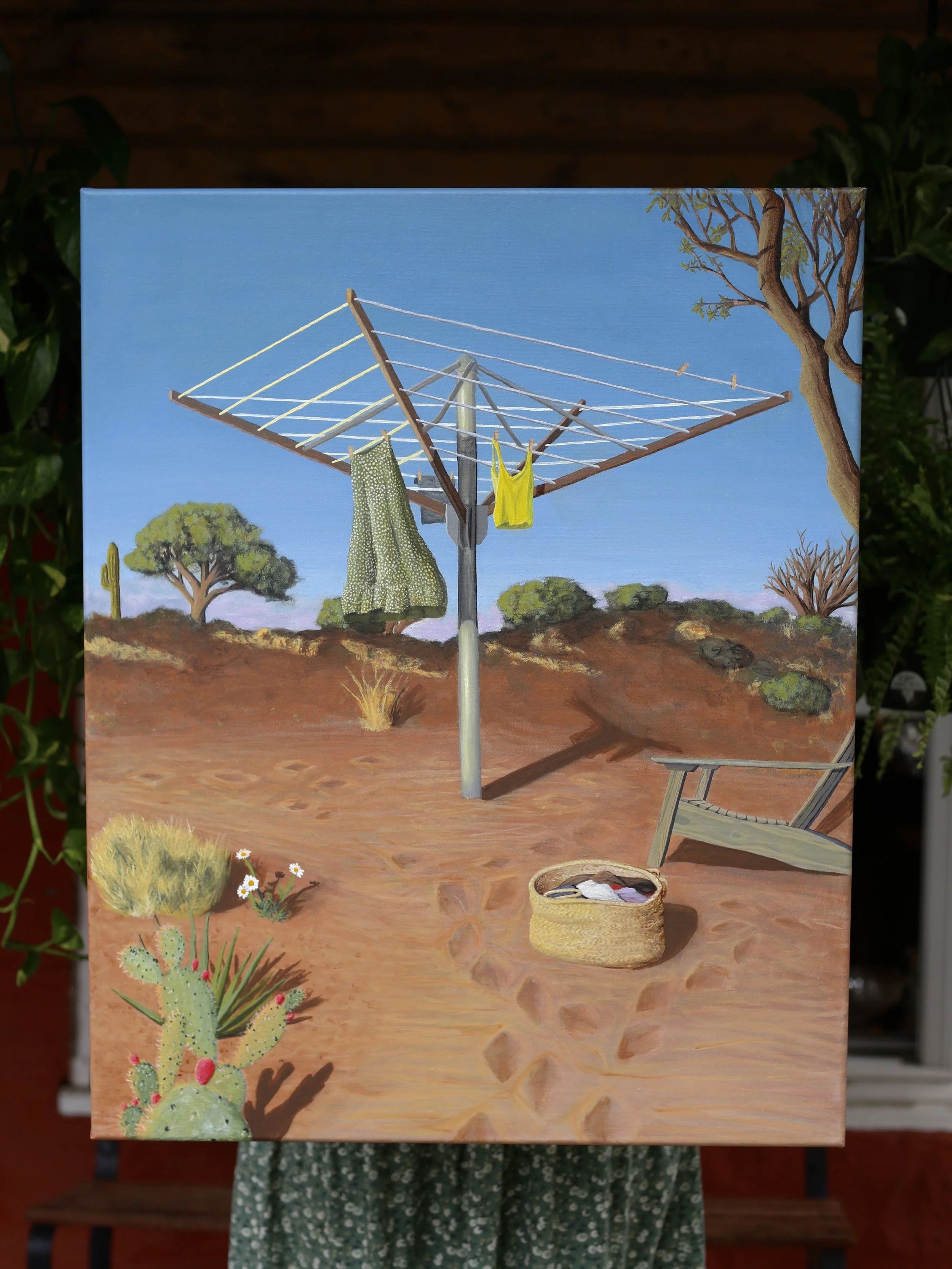 I think so much of this version of me I saw that night and so I pay tribute to her by making this painting of what I imagine to be a moment she could have missed if she stayed lost. Something so simple as laundry during magic hour, sun kissed in the desert. Simple but so beautiful with a storm just missing her on the horizon.